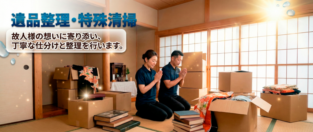故人様の思い出の品を、ご遺族様の気持ちに寄り添いながら丁寧に整理・仕分けいたします。遠方にお住まいで整理が進まない方や、家財道具の処分にお困りの方もご相談ください。孤独死現場などの特殊清掃・消臭も対応可能です。た安全な施工を行います。